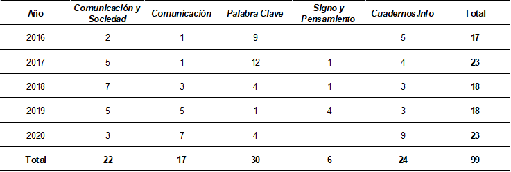 Durante el período abarcado en esta investigación (2016-2020), se editaron en total 59 números, entre los que se incluyen 21 monográficos (ver Tabla 2). De ese total (n=655), el 15,1% (n=99) de los artículos publicados en las cinco revistas latinoamericanas de comunicación mejor ubicadas en el ranking Scopus tiene como objeto de estudio temáticas relacionadas con la recepción y con el consumo, porcentaje que incluye a los artículos que son parte de los monográficos. La revista con más artículos sobre recepción y consumo es Palabra Clave (30,30%, n=30), le sigue Cuadernos.Info (24,24%, n=24), en tercer lugar, Comunicación y Sociedad (22,23%, n=22), la revista Comunicación se ubica en el cuarto puesto (17,17, n=17%) y la que menos artículos sobre recepción incluye es Signo y Pensamiento (6,06%, n=6). En el caso de Palabra Clave, el año más prolífico en manuscritos sobre el tema fue 2017, cuando la revista colombiana incluyó dos monográficos: uno sobre cultura transmedia (dirigido por investigadores colombianos) y otro acerca de fan studies (coordinado por académicos españoles). Se observa la misma relación en cantidad de artículos sobre la temática/publicación de monográficos en el caso de Comunicación y Sociedad, que en 2018 (cuando colecta la mayor cantidad artículos sobre recepción) difunde dos monográficos: uno sobre alfabetismo transmedia (a cargo investigadores/as de España, Portugal, Uruguay y Colombia) y otro acerca de análisis y recepción de cine en América Latina y Europa, sin coordinación externa. No ocurre lo mismo en los casos de Comunicación –que no tiene monográficos durante el período examinado– y la mayor cantidad de artículos sobre la temática de estudio coincide con un incremento general en la cantidad de trabajos incluidos en la revista cada año. En el caso de Cuadernos.Info, no se observa ninguna de las dos relaciones anteriores.