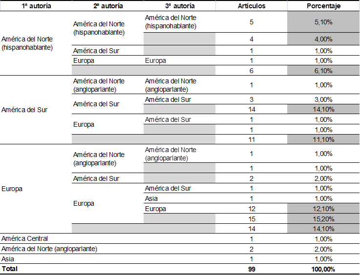 Sólo el 3% (n=3) de los artículos fue escrito por tres autores de América del Sur, y apenas el 1% lleva la combinación América del Norte (hispanohablante)/América del Sur. También los primeros autores de América del Norte (hispanohablante) se combinan preferentemente con investigadores del mismo ámbito geográfico (5%, n=5). En el 2% (n=2) de los casos, se da que el primer firmante proviene de universidades europeas; y el segundo, de América del Sur. La relación inversa se da sólo en el 1% (n=1) de los artículos relevados.