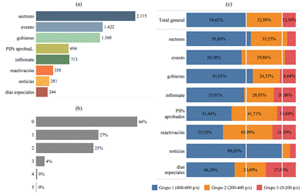 Se dividieron las páginas de Facebook estudiadas en tres grupos a partir de la cantidad de publicaciones de cada una: el grupo 1[8] tiene entre 400 y 600 publicaciones; el grupo 2[9], entre 200 y 400; en tanto el grupo 3[10], entre 0 y 200 publicaciones. Un primer hallazgo es que el Estado peruano creó una cantidad mayor de contenidos para los ministerios de carácter social (Cultura, Salud, Educación), y también para aquellos más ligados a rol del Estado en la economía (Transporte y Comunicaciones, y Producción), además de Defensa, que dirigió varias estrategias para apoyar a la Policía Nacional en el control del orden público en las calles ante la inmovilización social obligatoria.