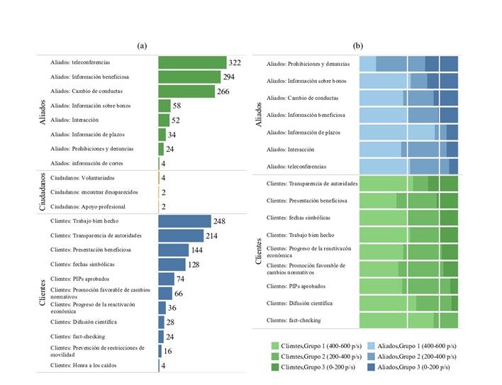 según roles de público. De las veintidós categorías, tres categorías de publicaciones que asumen al público como “aliados” y cuatro como “clientes” agrupan a la mayoría de las publicaciones en la muestra. El principal hallazgo es que la categoría “ciudadanos” es la más pequeña de las tres, con solo ocho publicaciones. Un ejemplo de ello es el video de la cuenta del Ministerio de Salud donde se indica: “Forma parte del equipo de profesionales que redoblará fuerzas en las regiones de Áncash, Piura, Loreto y Arequipa. Para conocer los perfiles de puestos e inscribirte ingresa aquí ➡️ https://cuidadores.minsa.gob.pe/cuidadorsalud/convocatoria3/ #LaSaludNosUne” (Ministerio de Salud del Perú, 2020a).
