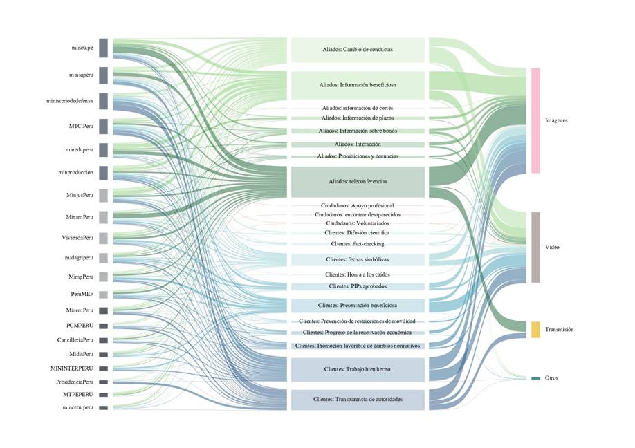 Hubo una preponderancia del primer tipo de publicaciones: en el caso del primer grupo, especialmente en las páginas de Cultura (73%), Defensa (66%), Producción (65%) y Transportes (56%); en el segundo grupo, en Economía y Finanzas (82%), Justicia (72%) y Vivienda (66%); mientras en el tercero, en Comercio Exterior y Turismo (73%), Energía y Minas (53%) y Desarrollo e Inclusión Social (51%). Respecto del formato de videos, en el primer grupo, Salud y Educación fueron los ministerios con más contenidos de ese tipo (64% y 50% respectivamente), y transmisiones (15% y 11%, respectivamente); en el segundo grupo, el contenido audiovisual fue más utilizado en las páginas de Mujer y Poblaciones Vulnerables (57% videos y 7% transmisiones), Agricultura (37% videos y 15% transmisiones) y Ambiente (36% videos y 14% transmisiones); finalmente, del tercer grupo destacaron las páginas de la Presidencia de la República (39% videos y 52% transmisiones ‑el mayor porcentaje en toda la muestra‑), Interior (84% videos), Trabajo y Empleo (75% videos) y la Presidencia del Consejo de Ministros (55% videos, 6% transmisiones).