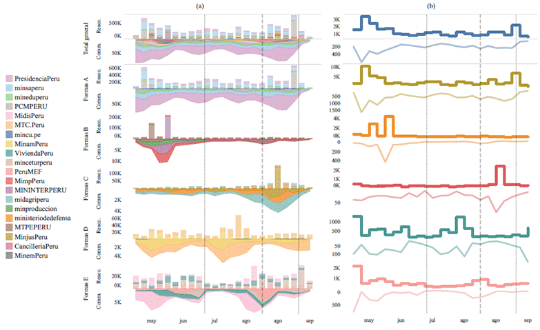 [7] Según la cantidad de interacciones se organizaron 5 conjuntos: formas A (Cultura, Educación, Salud, Presidencia del Consejo de Ministros, y Presidencia) que llegan hasta 600 000 reacciones y 50 000 comentarios; formas B (Mujer y poblaciones vulnerables, Interior, Producción, Trabajo y Cancillería) con un máximo de 200 000 reacciones y 10 000 comentarios; formas C (Agricultura, Defensa, Justicia) que tiene hasta 100 000 reacciones y 4 000 comentarios; formas D (Ambiente, Trabajo, Energía y Minas) con un máximo de 60 000 reacciones y 4 000 comentarios; y formas E (Desarrollo e Inclusión Social, Comercio Exterior, Economía y Vivienda) que llega hasta 20 000 reacciones y 5 000 comentarios.