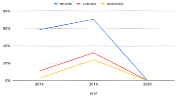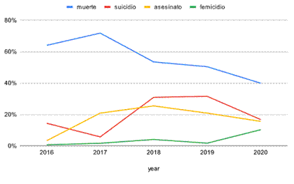 Para identificar cómo describieron los medios la muerte de los activistas, se analizó la frecuencia de aparición de cinco palabras candidatas: “muerte”, “suicidio”, “asesinato”, “homicidio” y “femicidio”. Utilizamos un script Python y la librería Spacy (https://spacy.io/) para cuantificar el número de apariciones de cada una de estas palabras. Se agrupan los resultados por caso noticioso y por año entre 2016 y 2020. Para comparar la evolución del uso de palabras en el tiempo, calculamos por cada palabra un porcentaje de uso que corresponde al número de apariciones de la palabra dividido por el número total de apariciones de las palabras candidatas. Este porcentaje nos permite evaluar cómo los periodistas deciden referirse al caso noticioso, eligiendo en ciertos casos un término neutro como “muerte”, o un término más comprometido, enfatizando el crimen (“asesinato”, “homicidio”, “femicidio”), o al contrario priorizando la pista del “suicidio”. Este dato nos permitirá ver si (a) los medios fomentan sensacionalismo con los casos; (b) invisibilizan la muerte de los activistas o (c) se adaptan palabras para definir las causas de muerte según los resultados en el avance de las investigaciones forenses.