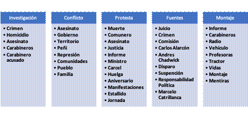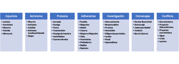 El quinto tópico describe un enfoque pericial sobre las causas de muerte y el proceso investigativo, mientras que el sexto resalta eventos relacionados con el caso, como la actuación de la cantante Denise Rosental en el Festival de Viña del Mar con una polera de Macarena Valdés y la conexión del caso con el de Berta Cáceres en Honduras en varios conversatorios realizados en universidades. Por último, aunque menos frecuente, se mencionan conceptos vinculados al ‘extractivismo’ y la lucha por el ‘agua’ debido a un ‘Proyecto Hidroeléctrico’, incluyendo la palabra mapudungun ‘lagmien’, que significa ‘hermana’ y se utiliza para referirse respetuosamente a las mujeres mapuche.