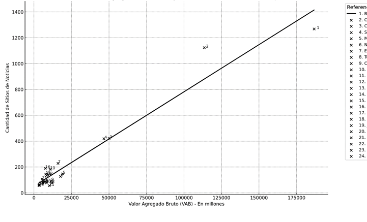 El gráfico muestra cómo el Valor Agregado Bruto (VAB) de las provincias argentinas se relaciona con la cantidad de sitios de noticias digitales. Cada punto representa una provincia, con el VAB en el eje horizontal y la cantidad de sitios en el vertical. La línea de regresión, que muestra una tendencia general, sugiere que a medida que aumenta el VAB de una provincia, también lo hace la cantidad de sitios de noticias digitales. Sin embargo, la dispersión de los puntos alrededor de esta línea indica que esta relación no es uniforme entre todas las provincias.