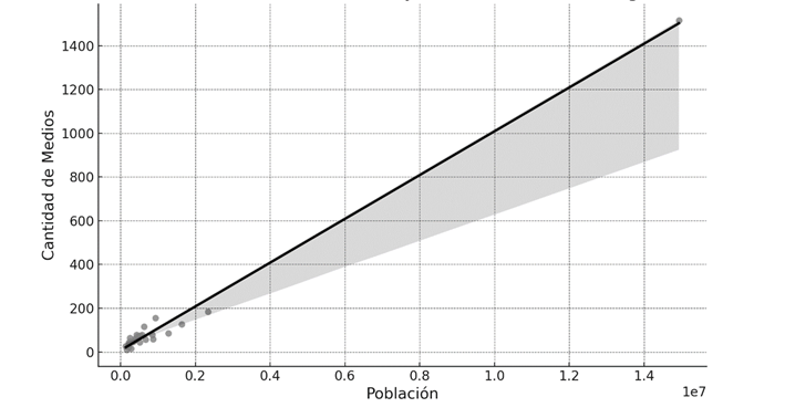 La correlación entre la cantidad de medios y la población en los grandes aglomerados urbanos reveló una fuerte relación lineal positiva (r = 0.995) e indicó que, a mayor población, mayor es la cantidad de medios. La correlación entre la cantidad de medios y la densidad poblacional, aunque positiva, fue moderada (r = 0.388) y sugiere que otros factores además de la concentración poblacional pueden incidir en la cantidad de medios disponibles.