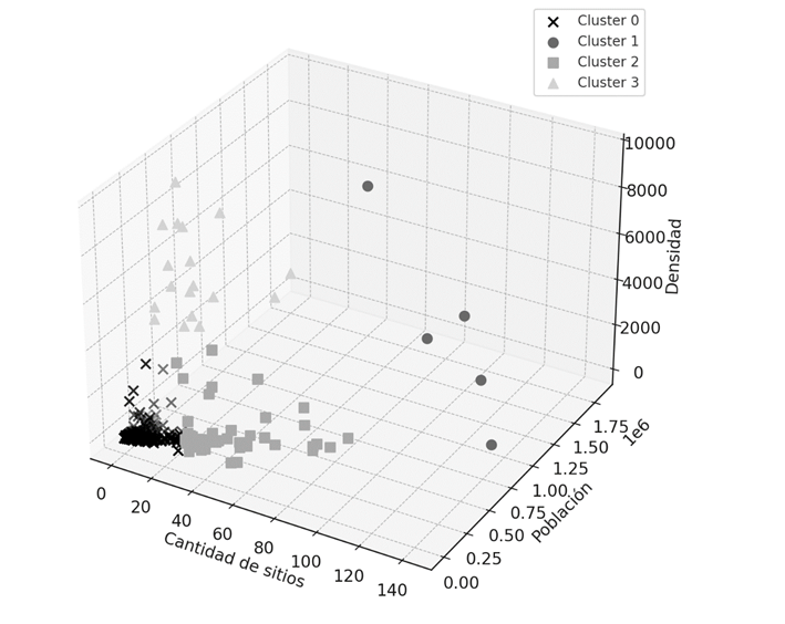 ● Características generales: compuesto por departamentos con alta población y densidad. Este clúster tiene una alta concentración de sitios, representando importantes centros urbanos.