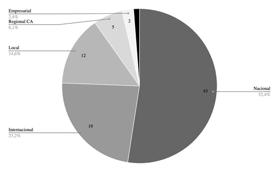 Al analizar las alianzas, solamente 17 publicaciones (solo cerca del 21%) evidenciaban su presencia: 5 entre empresas del sector privado, 3 entre academia y tercer sector; 2 entre academia y empresa, 2 entre gobierno y empresa privada; 1 entre academia y gobierno; 2 entre gobierno y organismo internacional; y solamente 1 donde varios tipos de actores tuvieron acción, que fue en el proyecto “RespiraUCR” de creación de ventiladores durante la pandemia por COVID-19.