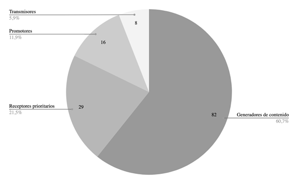La figura 3 detalla la distribución de los tipos de agentes de innovación en los casos analizados. Se identificó que en poco más del 50% de los casos se mostraron solo los generadores de contenido, sin ninguna otra mención a otro agente de innovación, y en 39% de los casos al menos se mencionaron dos tipos de agentes, siendo lo más frecuente que los generadores se acompañaran por receptores o por promotores. En Facebook, que no tiene limitación de extensión en los copys, llamó la atención que en gran parte de los casos analizados se construyó poco el mensaje asociado. En el caso de las noticias en medios masivos, el clickbait (de corte sensacionalista) y el gancho para crear interés (más legítimo y persuasivo) son las formas de llevar al usuario de la RRSS al tráfico web del propio medio en su dominio donde, por ejemplo, La Nación y El Financiero obligan a la suscripción con un costo. Para las instituciones, especialmente gubernamentales, esto no debería ser una estrategia por seguir y por esto es llamativo encontrar que no fueron en su mayoría las instituciones públicas quienes dieron un lugar en sus mensajes a los grupos beneficiarios o receptores de la innovación, sino que fueron los medios de información, a excepción de una publicación aislada de la Universidad de Costa Rica.