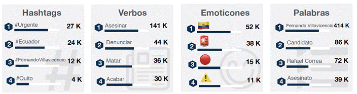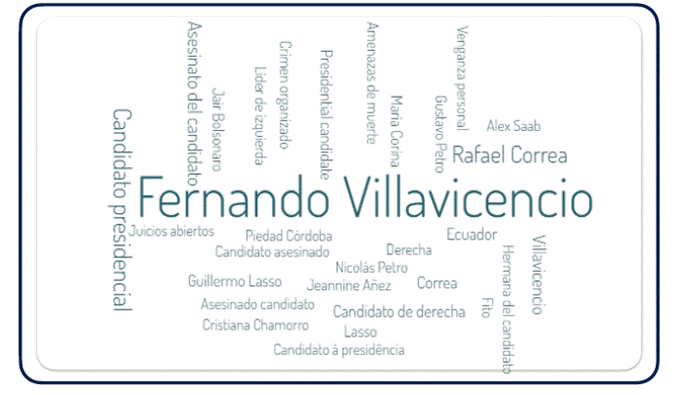 A partir de los elementos lingüísticos que predominaron en la conversación digital, tras las primeras 24 horas del asesinato, el nombre del periodista Villavicencio fue el más relevante (414.000 menciones), seguido de su condición de candidato y, en tercer lugar, apareció el nombre del líder de la Revolución Ciudadana, el expresidente Rafael Correa. Los verbos más frecuentes siguieron la línea de «asesinar» (141.000 menciones), «denunciar» y «matar»; es decir, el hecho noticioso.