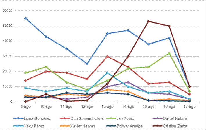 Sin embargo, su punto más alto de la conversación en red recién lo alcanzó el 15 de agosto, con más de 45.000 publicaciones, es decir dos días después del debate y cinco antes de que los más de 13.000.000 de ecuatorianos acudieran a votar.