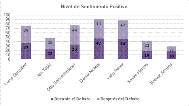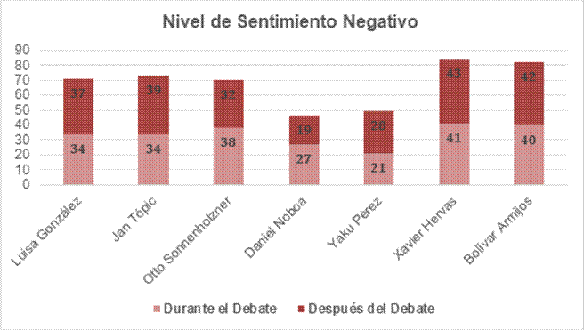 En el caso de Sonnenholzner y de Xavier Hervas (Movimiento RETO), que participaban nuevamente en un proceso electoral, las cifras muestran que el primero obtuvo un descenso de 6 puntos entre el debate y el post debate en sus números negativos, mientras que para Hervas hubo un incremento de sus puntos negativos en dos puntos.