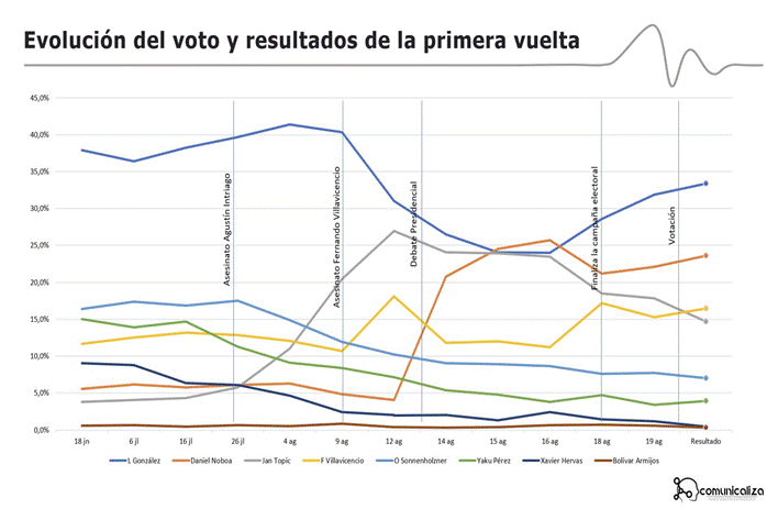 La conversación sobre la inseguridad y la violencia política no solo incide en la presencia digital de las candidaturas y en el encuadre temático, también guarda un correlato con la preferencia electoral. El descenso profundo y rápido de la candidata del correísmo, que fue observado en la conversación digital, fue el reflejo de la preferencia electoral. Esto también se evidencia con el crecimiento de Jan Topic, principal beneficiario del encuadre por haberse instalado en la seguridad como eje de conversación. Y el surgimiento de Daniel Noboa, principalmente a raíz del post debate.