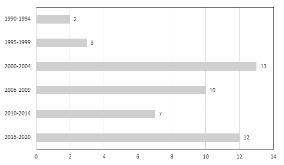 De atender al año de lectura de la tesis doctoral, se pone de manifiesto cierta extensión en la trayectoria académica de esta comunidad. La mitad de los participantes defendieron su doctorado en la década del 2000 (23 que suponen el 49%), coincidiendo con el incremento en la oferta de doctorados en comunicación, y un 40% más lo hizo en la década del 2010 (19 participantes) datos que revelan un interés de la comunidad investigadora en radio por progresar dentro de la academia.