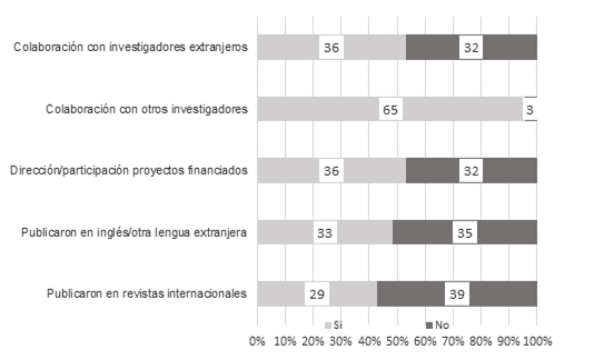 De atender al liderazgo en proyectos, si bien se vuelve a poner de manifiesto la existencia de un núcleo académico que ha dirigido dichos proyectos, en la línea de la dirección de tesis, se trata de un grupo sensiblemente más amplio (20 respondientes). El hecho de que estos proyectos financiados brinden la primera oportunidad de investigar a personal joven, en formación, podría proyectarse en un leve incremento en las personas directoras de tesis a corto-medio plazo, de hecho, un cuarto de los participantes en proyectos de investigación no contaba con el grado de doctor en el momento del estudio.