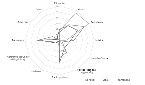 En lo que se refiere a Radio y Cultura, a pesar del peso que adquiere en la investigación individual (52% de los participantes la identifican como ámbito de trabajo), se pone de relevancia el limitado interés que suscita en los radio studies brasileños (identificado por el 23% de los participantes, que lo sitúan en la sexta posición en cuanto a su relevancia). Asimismo, se aprecia una mayor proximidad de la producción científica individual a los radio studies globales, en los que la relación entre radio y cultura se percibe como una de las líneas dominantes en la producción de la comunidad científica (señalada 44% de los participantes, que la tercera posición).