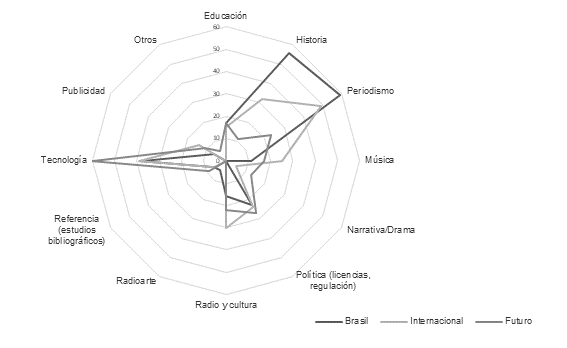 Los investigadores señalan el importante peso de la tecnología en detrimento de temáticas clásicas en los radio studies como el periodismo o la historia, en la academia brasileña. Las transformaciones vividas por la radio y la pujanza del audio online, que ha llevado a la multiplicación de medios sonoros (Piñeiro-Otero y Pedrero-Esteban, 2022), han llevado a consenso de los académicos (el 88% de los participantes) a la hora de situar la tecnología como la temática hegemónica a corto-medio plazo. Otras temáticas que alcanzarán más pujanza a medio-largo plazo son las relacionadas con las licencias, regulación, directamente relacionadas con el desarrollo tecnológico y la nueva concepción de transmisión radiofónica, el periodismo y la relación del medio con la cultura (señaladas por el 40%, 34% y 32% de los participantes, respectivamente). Unos ámbitos que, si bien reflejan los objetos predominantes en la investigación individual-global, están estrechamente vinculadas con las nuevas formas de la radio, su regulación, las transformaciones en su producción y consumo.