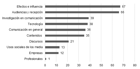 En relación con el objeto específico de la investigación, los participantes han identificado los efectos e influencia de la radio y las audiencias como principales enfoques (señalados por el 20% de las participantes), seguido de la investigación en comunicación y tecnología (con el 12% de las respuestas).