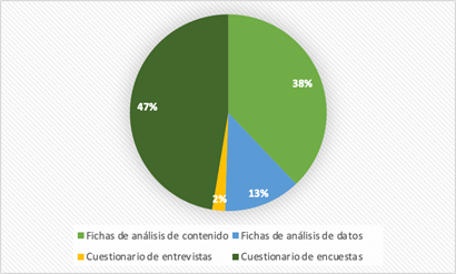 Tras examinar los diseños de investigación empleados por los autores, se procedió a analizar los instrumentos utilizados por las 77 investigaciones seleccionadas para este estudio, tal como se refleja en la Figura 4. Esta representación gráfica revela que uno de los instrumentos más recurrentes en la investigación sobre influencers en Instagram son los cuestionarios para encuestas (47%). Asimismo, se constató que las fichas de observación son herramientas útiles para recabar información adicional sobre datos o comportamientos. Se distinguieron dos tipos de fichas: una enfocada en los comportamientos de los usuarios o influencers (38%), y otra empleada para registrar datos derivados de la interacción (13%). Por otra parte, se observó que un 2% utilizó cuestionarios dirigidos a entrevistas en profundidad.