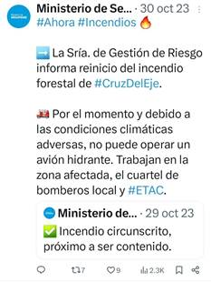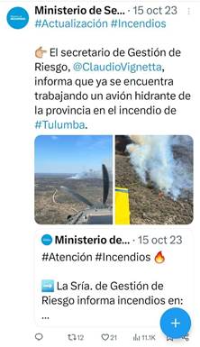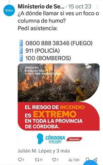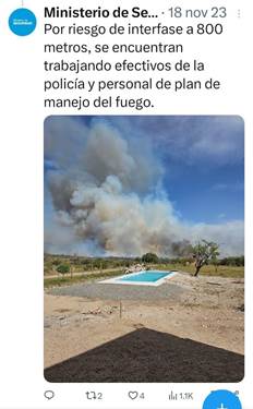El Ministerio de Seguridad utiliza sus redes sociales para concientizar en la prevención de incendios forestales como también para informar sobre lo que sucede. Dirige sus mensajes a los diversos públicos involucrados en la problemática, los que se construyen de acuerdo con el contexto en que tiene lugar el fenómeno[2].