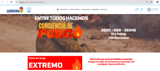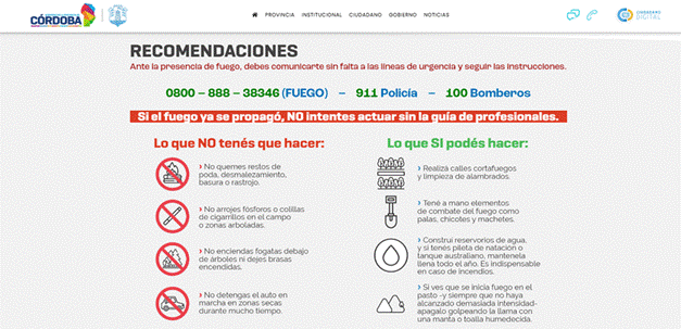 Ante el riesgo de incendios forestales en la provincia de Córdoba, el Ministerio de Seguridad, a través de la página web oficial (www.cba.gov.ar/prevencion-incendios), informa sobre este riesgo, donde se destaca lo siguiente: