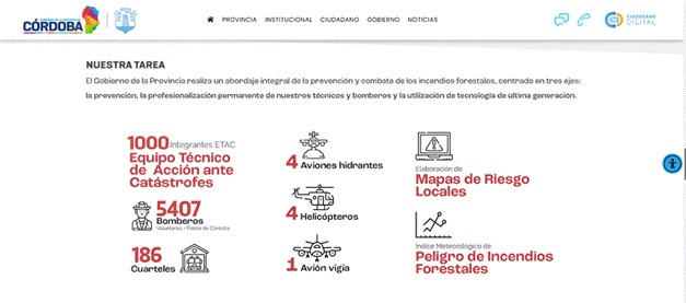 El Gobierno de la Provincia de Córdoba desarrolla diversas acciones de comunicación del riesgo durante situaciones de crisis provocadas por incendios forestales de gran magnitud. Las estrategias utilizadas son comunicados oficiales, alertas tempranas, conferencias de prensa, publicaciones en redes sociales y cobertura en medios de comunicación masivos. El objetivo central es informar a la población sobre zonas afectadas, condiciones meteorológicas adversas, medidas de autoprotección, evacuaciones y restricciones de acceso.