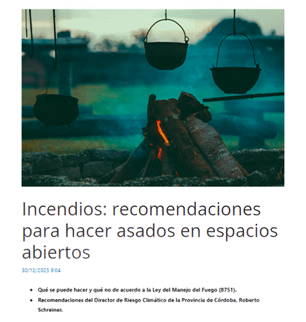 Incendios: recomendaciones para hacer asados en espacios abiertos (2023). Noticias. Gobierno de Córdoba. https://prensa.cba.gov.ar/informacion-general/incendios-recomendaciones-para-hacer-asados-en-espacios-abiertos/