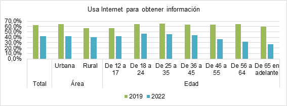 La figura 2 ilustra la evolución en el uso del internet para obtener información antes y después de la pandemia de 2020. Hasta 2019, solo el 63.3 % de la población declaró haber usado internet; para 2022, este porcentaje se incrementó en casi 10 puntos, al llegar al 72.7 %. Este incremento ocurrió tanto en área rural (de 45.7 % a 54.2 %) como urbana (de 71.2 % a 81.1 %). Paradójicamente, hay un decrecimiento en la apropiación de esta tecnología para recopilar información; esto puede explicarse a partir del fenómeno de las fake news, dado que 246 circularon en Ecuador en los primeros seis meses de 2020 (Bayas Ramírez, 2021). Las estrategias más utilizadas fueron presentar información sesgada, sin equilibrio de fuentes; y la manipulación deliberada para distorsionar los hechos; es decir, los últimos niveles de acuerdo con Fetzer (2004). Asimismo, durante la pandemia fue muy común la creación de contenido que excitara las emociones, en especial miedo o ira, para afectar la lógica de razonamiento y facilitar la divulgación, ya que las emociones tienen la capacidad de nublar la comprensión del público y, a medida que se hiperbolizan los hechos, agudizar las divisiones existentes.