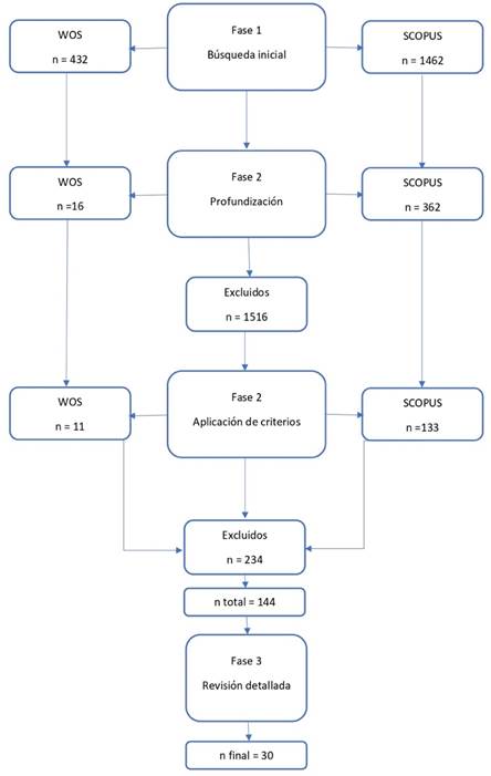 La extracción de datos se realizó en tres etapas: la primera consistió en la búsqueda de los descriptores en la base de datos WOS introduciendo una búsqueda de tópicos asociados a social media y universidades españolas, tanto en español como en inglés. En Scopus, bajo el parámetro “todos los campos” se introdujeron entre comillas los mismos términos. En la segunda etapa, denominada “profundización”, se añadieron los términos de búsqueda comunicación y marketing (en inglés, español). Finalmente, dentro de la misma etapa, pero en la actividad llamada “aplicación de criterios” se añadieron los condicionales definidos: limitar por artículos, años e idioma; también fue necesario limitar la búsqueda a Ciencias Sociales y al país (España). En la tercera fase, ya en el proceso de revisión detallada sobre el contenido de los documentos, se determinó que si existía una coincidencia de repetición solo se consideraría como un único trabajo. En esta fase se decantó la información según la pertinencia con el objetivo de la investigación. Se decidió no realizar otra limitación por palabra debido a que la cantidad era manejable y no se quería dejar afuera artículos que pudieran ser también sujetos de análisis. Al eliminar los duplicados resultan 104 artículos, de los cuales treinta fueron tomados como muestra resultante.