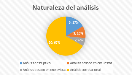 En primera instancia, respondiendo a la naturaleza del análisis, cinco artículos (17%) desarrollan un análisis descriptivo o documental, tres artículos (10%) realizan únicamente encuestas, dos artículos (6%) desarrollan entrevistas, y finalmente veinte artículos (67%) muestran un análisis correlacional.