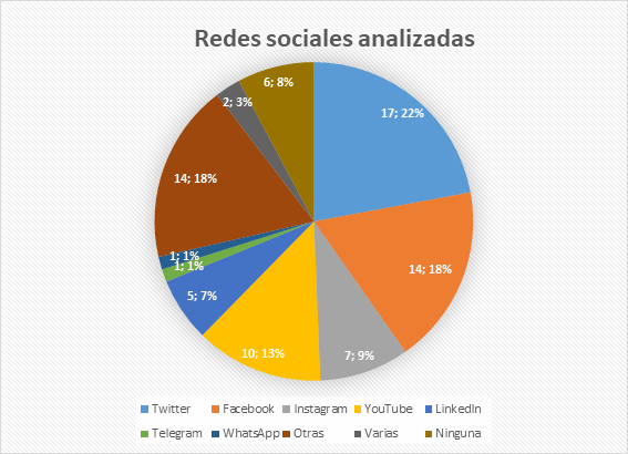 Respecto a las redes sociales analizadas, 17 artículos (22%) analizan Twitter, 14 artículos (18%), Facebook; siete artículos (9%), Instagram; 10 artículos (13%), YouTube; cinco artículos (7%), LinkedIn; un artículo (1%), Telegram; un artículo (1%), WhatsApp, y 14 artículos (18%) manejan otras redes sociales, incluyendo Google+ y redes sociales académicas (ocho, 10%) como ResearchGate (Montesi y Villaseñor, 2018); en seis artículos (8%) no se menciona una red social en particular. Algunos casos interesantes son García García (2018), García-Gordillo et al. (2023), y Pérez-Bonaventura & Rodríguez-Llorente (2023), que analizan una gran cantidad de redes sociales.