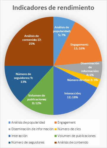 En relación con los indicadores de rendimiento de marketing, si bien los treinta artículos cuentan con aspectos comunes y análisis mixtos, en cinco artículos (7%) se desarrolla un análisis de popularidad, en once artículos (16%) se incide en la tasa de engagement, en cuatro (6%) se hace referencia a la diseminación, en dos artículos (3%) se llama la atención sobre número de clics, doce (18%) se refieren específicamente a la interacción, ocho artículos (12%) hacen referencia a la relación con el volumen de publicaciones, en nueve (13%) se da importancia al número de seguidores y en diecisiete (25%) se profundiza análisis de contenido.