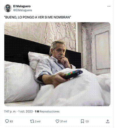 El meme con mayor repercusión fue retomado tanto por Infobae como por Clarín y se refiere temáticamente a quien ejercía como presidente argentino en ese momento, Alberto Fernández, quien no se presentaba a la reelección, y no estaba presente en el público del debate. Tenía 37.000 likes y 2000 reposteos. El meme combinaba dos materias significantes: la foto manipulada y el texto lingüístico. No usaba ningún hashtag, pero mencionaba explícitamente al debate. En el contenido visual se aludía al presidente en la cama visualizando la transmisión televisiva. Con la imagen fotográfica editada se generaba una operación de sentido figural que escenificaba la situación aislada del presidente y la invisibilización de su figura en el debate. A partir del texto lingüístico: “bueno, lo pongo a ver si me nombran”, se generaba una operación figural de concretización que redundaba en el rol marginal de la figura presidencial en la disputa electoral (figura 1).