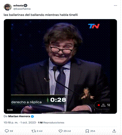 El segundo meme con mayor cantidad de likes fue publicado por La Nación y se refiere a la postura tranquila de Milei en el debate mientras era atacado. Se retoman de manera indirecta los motivos temáticos que cuestionaban la salud mental del candidato, al comparar el gesto burlón y tranquilo del líder político mientras era acusado por sus oponentes, con la posición que podrían tener las bailarinas de un programa televisivo muy popular, Showmatch, frente a su jefe, conductor de la emisión. Este meme combina una captura de pantalla del debate – que escenifica la tranquilidad del candidato- con el texto lingüístico en el que se hace una comparación con las mujeres escuchando pacientemente a su jefe (figura 2). Así, el meme enfatiza en el carácter doblemente extraño de Milei frente al discurso de sus oponentes. Por un lado, la extrañeza se debe a su carácter explosivo y a su estilo de comunicación en campaña hiperbólico (Slimovich, 2025); y por otro lado, por la reacción que se espera de un contrincante cuando su interlocutor en el debate lo acusa de graves acciones. De esta manera, uno de los memes con mayor repercusión se monta sobre una de las pruebas extratécnicas (Barthes, 1985) más presentes en los discursos digitales referentes a Milei por parte de sus opositores que estaba vinculada a la poca capacidad de demostrar habilidades sociales y comunicativas en espacios mediáticos.