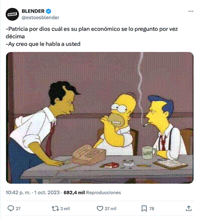 El tercer posteo en cantidad de likes fue difundido por La Nación y combina el texto lingüístico con el dibujo animado, específicamente con una imagen de Los Simpson. El grueso de la operación figural está emplazado en el texto lingüístico que reproduce un supuesto diálogo entre la candidata Patricia Bullrich y sus asesores en los cuales le avisan que le están preguntan por el plan económico. De esta manera, se apela a un internauta telespectador en ese momento del debate electoral que está observando que Milei le insiste a Bullrich para que ella especifique cuál es su plan económico de resultar electa presidente. De esta manera, el meme se centra en el silencio de la candidata frente a la pregunta y repregunta, y deja en un segundo plano al interlocutor –Milei- y su insistencia- En efecto, el diálogo representado en la imagen escenifica a una persona que no quiere hacerse cargo de la pregunta, y a la que Homero debe recordarle cuál es la pregunta que le están haciendo. Así, el posteo se monta sobre el verosímil mediático (Metz, 1974) que le otorga a Bullrich un escaso conocimiento y capacidad de gestión, frente a su interlocutor, economista, Milei (figura 3).