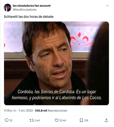 El cuarto posteo en cantidad de likes fue difundido por Clarín y combina una captura de pantalla televisiva con texto lingüístico. El meme posee 23.000 likes y 2000 reposteos. Se construye haciendo referencia con la imagen a la serie televisiva Los simuladores, con el trazado gráfico sobreimpreso alude a Córdoba y con el texto lingüístico contextualiza que alude a la insistencia del candidato Juan Schiaretti a resaltar su gestión en la provincia argentina de Córdoba. De esta forma, la imagen funciona como relevo del texto lingüístico (Barthes, 1985).