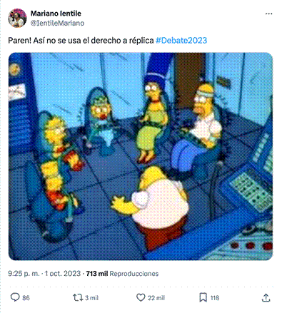 La Nación. (3 de octubre de 2023). Los memes del debate presidencial 2023: Massa, Milei, Bullrich, Bregman y Schiaretti. La Nación. https://www.lanacion.com.ar/politica/los-memes-del-debate-presidencial-2023-nid01102023/