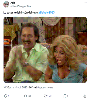 Por otro lado, algunos de los tuits seleccionados ni siquiera en puridad constituyen un mensaje que se pueda enmarcar en la categoría de meme, como los dos de tipo solo textual más virales que hemos destacado del caso español. Se incluyen por su viralidad o por el protagonismo de sus autores, en algunos casos, pero tensionan la categoría de meme -si atendemos a la idea de “meme-imagen” de Horta (2023), que aportamos más arriba-, a pesar de que aparecen en piezas que justamente prometen “los mejores memes del debate”.