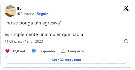 Entre los tuits más virales, la mayoría con varios millares de Me gusta, existe una gran diferencia entre el primero más difundido (figura 8), publicado en la pieza de La Vanguardia, y el resto. Se trata de una especulación jocosa del comunicador Jordi Évole que se pregunta qué estará haciendo el candidato del Partido Popular, Alberto Núñez Feijóo, debido a su ausencia en el debate y que alcanzó 41.500 Me gusta y 11.000 reposteos. Curiosamente, el segundo tuit seleccionado (figura 9) con más repercusión (12.800 Me gusta y 2000 reposteos), también compilado por La Vanguardia, tampoco responde, como el anterior, a un meme al uso. Consiste también en un posteo solo textual donde la tuitera @BuArena (27.000 seguidores) realiza un alegato desde el punto de vista de la igualdad de género: entrecomilla la frase “no se ponga tan agresiva”, dirigida por el líder de VOX, Santiago Abascal, a la líder de Sumar, Yolanda Díaz, y a continuación destaca que “es simplemente una mujer que habla”. Así hace alusión a una maniobra señalada como micromachismo (Bonino, 1995), un comportamiento habitual durante un intercambio dialéctico con mujeres a las que se les indica que están “nerviosas” o “alteradas” para menospreciarlas y sobreponer la autoridad de los hombres por encima de la de las mujeres.