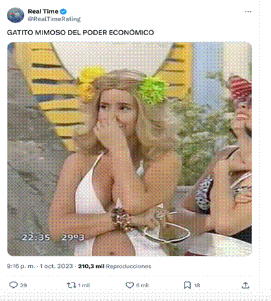 En relación con los motivos temáticos recurrentes de los memes, predominan aquellos que retoman fragmentos polémicos del debate. Uno de los momentos más replicados en los memes es en el que Myriam Bregman señala a Milei como un “gatito mimoso de los poderes económicos”. Esta forma lúdica de denunciar la connivencia entre el candidato y las grandes empresas se traslada a los internautas políticos y sus producciones meméticas. En los posteos este fragmento es reproducido a través de capturas de pantalla, pero también a través de la alusión a producciones discursivas digitales que han cristalizado en memes y que están vinculadas a la cultura mediática. Es el caso de la figura 6, en la cual en el texto lingüístico se alude al fragmento del debate: “la alusión al gatito mimoso” y en la imagen se visualiza un fragmento de la serie televisiva Casados con hijos, en la cual una de las protagonistas se está riendo, y que es usualmente utilizada como parte de las producciones meméticas.
