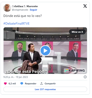 Entre las unidades más virales, los dos siguientes memes comparten la temática de la ausencia del candidato Feijóo del debate y cifras muy similares. Uno fue seleccionado por El Mundo y llegó a los 6700 Me gusta y 1000 reposteos y el otro, por ABC y La Vanguardia, alcanzó los 6200 Me gusta y 2000 RT. En ambos se utiliza como referencia cultural una imagen cinematográfica, procediendo en el primer caso de la comedia Aterriza como puedas (Jim Abrahams, David Zucker, Jerry Zucker, 1980), en concreto una escena en la que un muñeco hinchable simula ser el piloto automático a los mandos de un avión, lo que se utiliza como paralelismo de la (no) intervención del candidato del Partido Popular en la emisión. En el segundo caso, la intertextualidad la proporciona un GIF muy utilizado en la creación de memes y reacciones en internet extraído de la película Pulp Fiction (Quentin Tarantino, 1994) en el que el actor John Travolta aparece con actitud perdida y despistada.