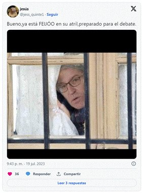 En lo tocante a la intertextualidad, el ámbito audiovisual es el más recurrente: el cine es el principal referente con 7 casos en los que destacan, además de los indicados más arriba, la mención a uno de los fenómenos cinematográficos de 2023, la película Barbie (figura 13) ‑con Yolanda Díaz como la homónima protagonista y Pedro Sánchez como Ken- que se une a otros menos recientes como La vida de Brian de los Monty Python o la película española Las que tienen que servir (en una crítica muy agresiva que utiliza imágenes de Yolanda Díaz planchando, que se difundieron en un vídeo de campaña de su partido, Sumar). La televisión con 4 referencias es también un intertexto recurrente, remitiendo a dibujos animados o a programas nacionales como el del cómico José Mota y su personaje “La vieja del visillo” (figura 14), que en dos ocasiones diferentes se compara con Feijóo. Asimismo, encontramos dos alusiones a videojuegos y uno a la prensa, en concreto a una portada de una revista del corazón que en un fotomontaje simulaba la boda de Abascal y Feijóo en una alusión a las alianzas y posibles pactos entre VOX y PP. También hay algunos referentes propios de las redes e internet como fotografías plantilla o GIF, arriba mencionados. Por último, resultan interesantes también las referencias al desarrollo de la vida política, en especial, el uso de la expresión utilizada por Yolanda Díaz en varias ocasiones en el Congreso de los Diputados “le voy a dar un dato”, o la malhadada expresión que alude al terrorismo etarra usando el nombre de uno de sus dirigentes, “Que te vote Txapote”, que se hizo fatídicamente popular entre seguidores de la ultraderecha en pintadas, pancartas o cánticos durante la campaña.