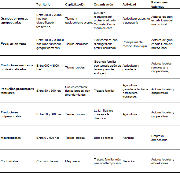 En cuarto lugar, tomando como referencia el trabajo de Muzlera (2013), es posible construir la siguiente tipología de sujetos agrarios en la región pampeana a partir de la identificación de su relación con el territorio, su nivel de capitalización (tierra y equipamiento), su organización, el tipo de actividad y sus relaciones externas: grandes empresas agropecuarias, pools de siembra, productores medianos profesionalizados, pequeños productores familiares, productores unipersonales, rentistas y contratistas. En el caso en estudio, el universo de productores rurales está conformado por los subtipos productores medianos profesionalizados, pequeños productores familiares y productores unipersonales. Las categorías rentistas y contratistas son ya vías de salida del sujeto productor (ver Tabla 1).