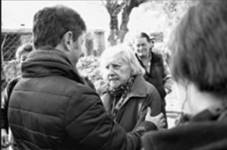 En la Figura 7, el candidato conversa con un grupo de mujeres en la localidad de San Antonio de Areco. Creemos que, por sobre las figuras de los tres protagonistas, en la imagen prevalece un elemento dispuesto en el espacio referencial que, aun tratándose de una fotografía (Dubois, 1986) o de un plano fílmico (Mitry, 2006), comporta información que predica al conjunto de la narración. Nos referimos al muro sin revestimiento que sirve de fondo de la imagen y que atraviesa y traspasa a los laterales del encuadre, de modo que su longitud continúa en el espacio denominado off o fuera de cuadro.