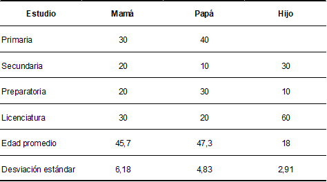 La Tabla 3 muestra las características generales de las familias tradicionales entrevistadas en relación con el porcentaje de nivel de estudios y promedio de edad. Al respecto, el 30% de los hijos estudian la secundaria; y el 60%, la licenciatura. En el caso del papá, hay un comportamiento similar en el nivel de estudios, resaltando asimismo que el 30% de las madres cuenta con estudios de licenciatura. Con respecto a la edad, se puede decir que son relativamente jóvenes, obteniendo edades medias de 45,7 años para la mamá y 47,3 años para el papá. La desviación estándar de los padres indica que se registraron rangos más amplios de edades en la mamá que en el papá. La edad de los hijos está entre la adolescencia y la juventud.