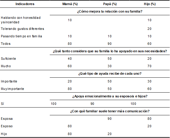 Posteriormente, desde el aspecto de apoyo emocional, el 100% de las mamás, el 90% de los papás y el 100% de los hijos mencionaron apoyarse emocionalmente. Este tipo de resultados obedece a la comunicación que existe en la familia. Por último, las mamás indicaron que tienen la misma comunicación con su esposo e hijos (80%), los papás con su esposa (90%), y los hijos con su mamá (Tabla 5).