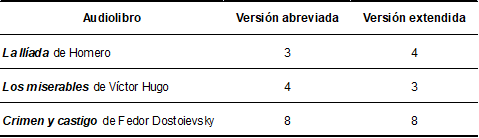 De acuerdo con la duración, los audiolibros se agrupan en dos tipos de versiones: sintetizadas o abreviadas y extendidas o completas. Las versiones abreviadas son un resumen de la obra y pueden ser empleadas para aproximar a las personas a la lectura de la versión digital publicada en diversas plataformas o bien para ofrecer una versión sintetizada de ella, en tanto que las extendidas narran de forma literal y completa la obra literaria.