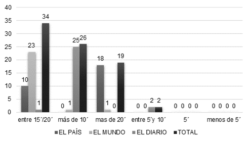 Los tres podcasts informativos diarios se construyen a partir de la conversación grabada con periodistas de la redacción y especialistas, aderezada después con música, fondos de ambiente y, en ocasiones, fragmentos de series y películas o archivos documentales. Las fuentes, a priori periodísticas, son las que condicionan el discurso narrativo en cada caso. En cuanto a la duración, la media oscila entre 15 y 20 minutos (34% de títulos analizados). El más breve es Un tema Al Día; los episodios de El Mundo al día tienden a aproximarse a los 15 minutos, mientras que Hoy en El País acostumbra a superar los 20 minutos. Durante el periodo analizado apenas una cuarta parte de la muestra rebajó los 10 minutos (23%); una tercera parte (32%) superó esa barrerea, y un 42% superó los 15 minutos (figura 1).