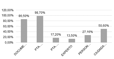 Atendiendo a la particularidad narrativa del formato –uno de sus rasgos distintivos–, tres cuartas partes (75%) de los podcasts analizados se han clasificado como “charla”, si bien, y debido al abundante uso de recursos sonoros y a la complejidad del montaje, se podrían categorizar como “charlas reportajeadas”. Esa etiqueta se refuerza ante la gran variedad de fuentes y voces empleadas: se combinan testimonios documentales con los de expertos y ciudadanos, entre otras (figura 3). En la práctica totalidad de los episodios se escucha a periodistas del propio diario. En el caso de El Mundo al día y Un tema Al Día, la voz invitada es casi siempre la del redactor que firma un artículo publicado ese día, de forma que el podcast sirve de promoción y de llamada a leer la información escrita. Son piezas claramente de autoreflexión sobre los temas que, según Dowlling y Miller (2019), y junto a la transparencia en el proceso de información, se convierten en ingredientes básicos en el podcast periodístico.