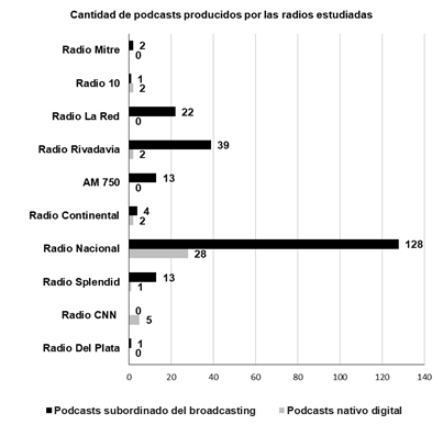A su vez, es posible destacar que el volumen de producción de podcasts no guarda una relación directa con las emisoras de mayor audiencia en el escenario broadcasting. Este dato se constata con el ejemplo de Radio Mitre, que siendo la radio más escuchada de la Argentina solo presenta dos propuestas de podcasts.